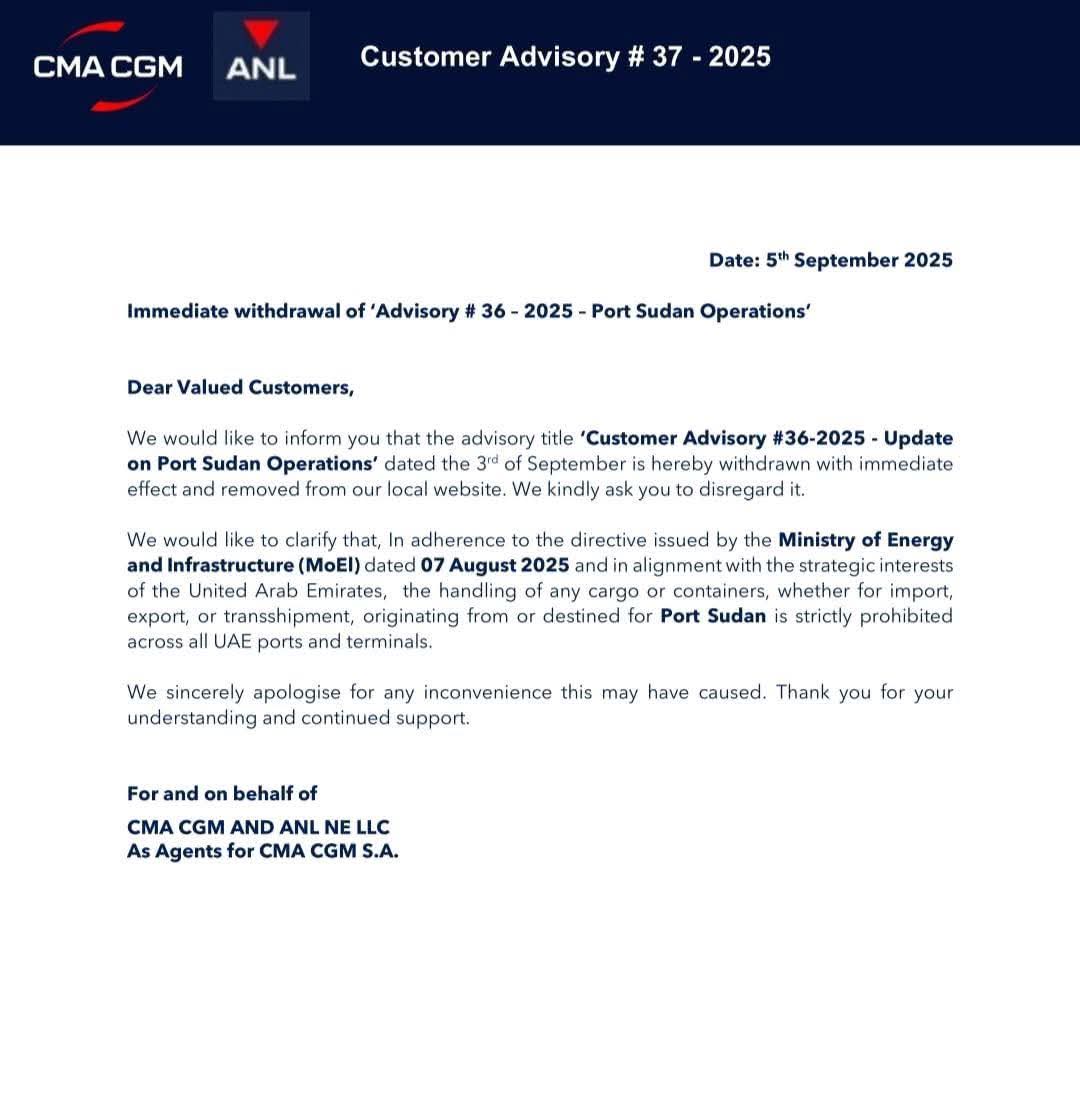 متابعات _ موجز الأحداث _ في تطور مفاجئ، ألغت شركة الشحن العالمية CMA-CGM، خلال 48 ساعة فقط، إشعارها السابق الذي سمح باستقبال السفن القادمة من ميناء بورتسودان إلى ميناء جبل علي في دبي، معلنةً سحب التعميم رقم (36-2025) الصادر بتاريخ 3 سبتمبر، وذلك امتثالاً لتوجيهات رسمية من دولة الإمارات.