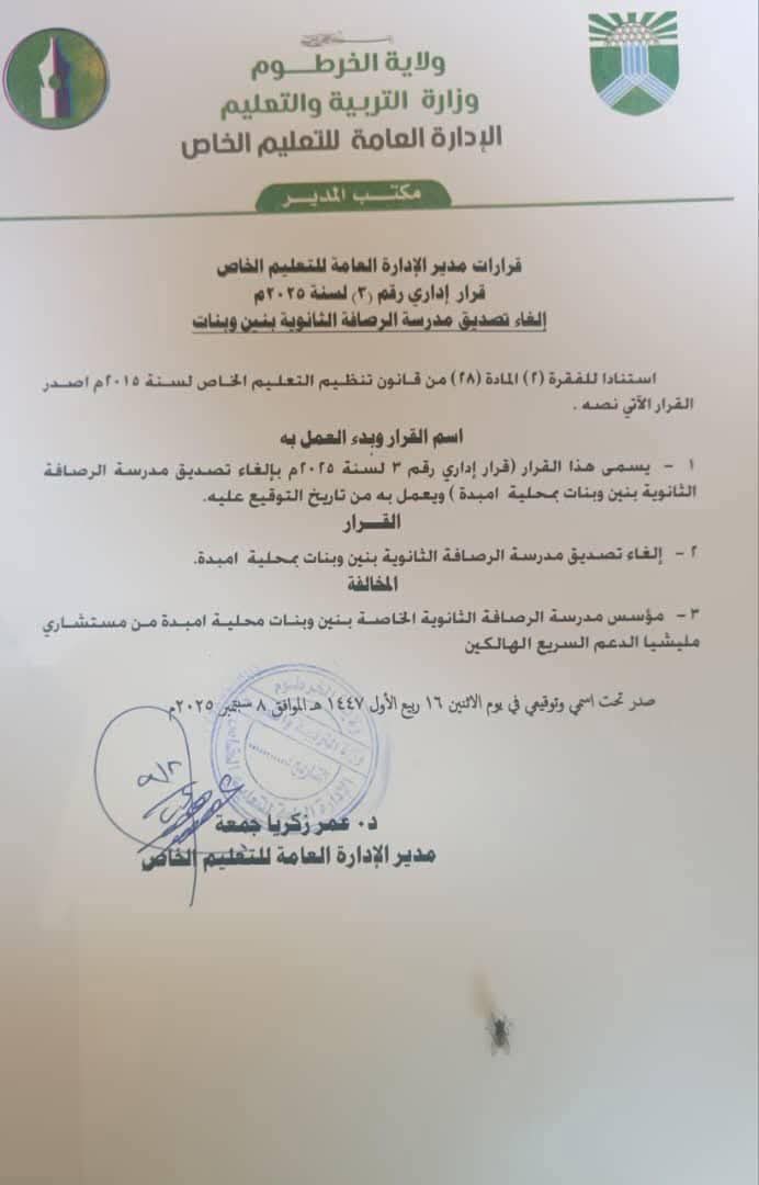 وأوضح القرار أن مؤسس مدرسة الرصافة الثانوية يعمل مستشارًا لدى مليشيا الدعم السريع المتمردة، وهو ما اعتُبر مخالفة جسيمة للقوانين والضوابط المنظمة للعمل التعليمي.