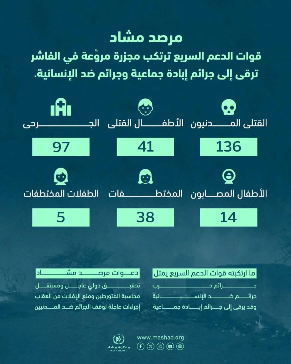وأكد مرصد مشاد أن ما تقوم به قوات الدعم السريع يمثل نمطًا ممنهجًا من الجرائم المنظمة، يهدف إلى إبادة سكان الفاشر وترويع المدنيين، محمّلًا قيادة المليشيا المسؤولية الكاملة عن هذه الجرائم. ودعا إلى فتح تحقيق دولي عاجل ومستقل يضمن محاسبة جميع المتورطين ومنع الإفلات من العقاب.