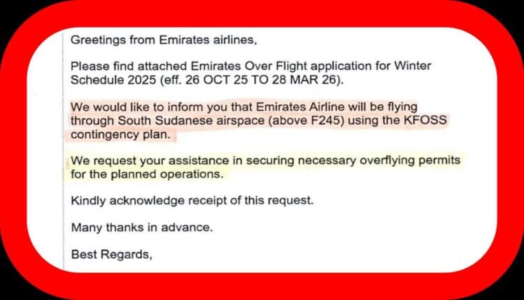متابعات _ موجز الأحداث _ كشفت مصادر مطلعة أن شركة طيران الإمارات تقدّمت رسميًا إلى سلطة الطيران المدني السودانية بطلبٍ للحصول على تصريح عبور المجال الجوي لجنوب السودان عبر النقطة الجوية (F245)، وذلك باستخدام خطة الطوارئ (KFOSs) بتاريخ 14 أكتوبر الجاري.