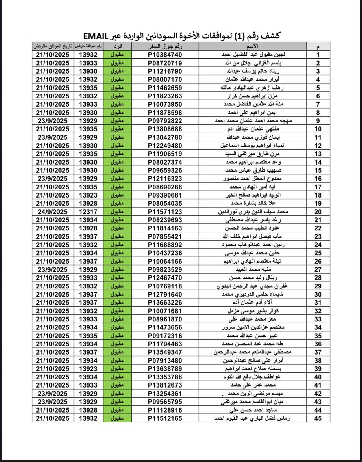 كما أرفقت القنصلية قوائم بأسماء الطلاب الذين صدرت لهم الموافقات الأمنية، داعيةً إياهم إلى التوجه مباشرة إلى القنصلية المصرية بجدة لاستكمال بقية الإجراءات المطلوبة.