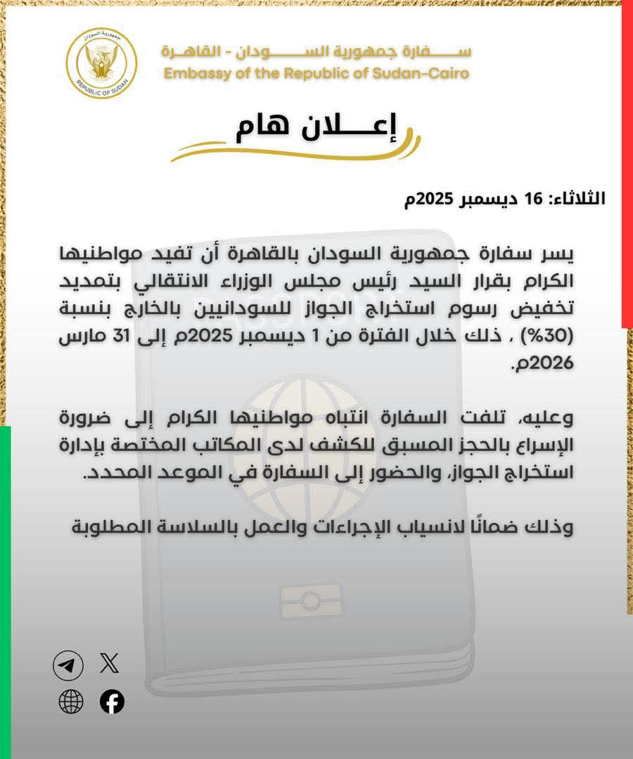 تنويه مهم من سفارة السودان بالقاهرة بشأن تخفيض استخراج الجوازات