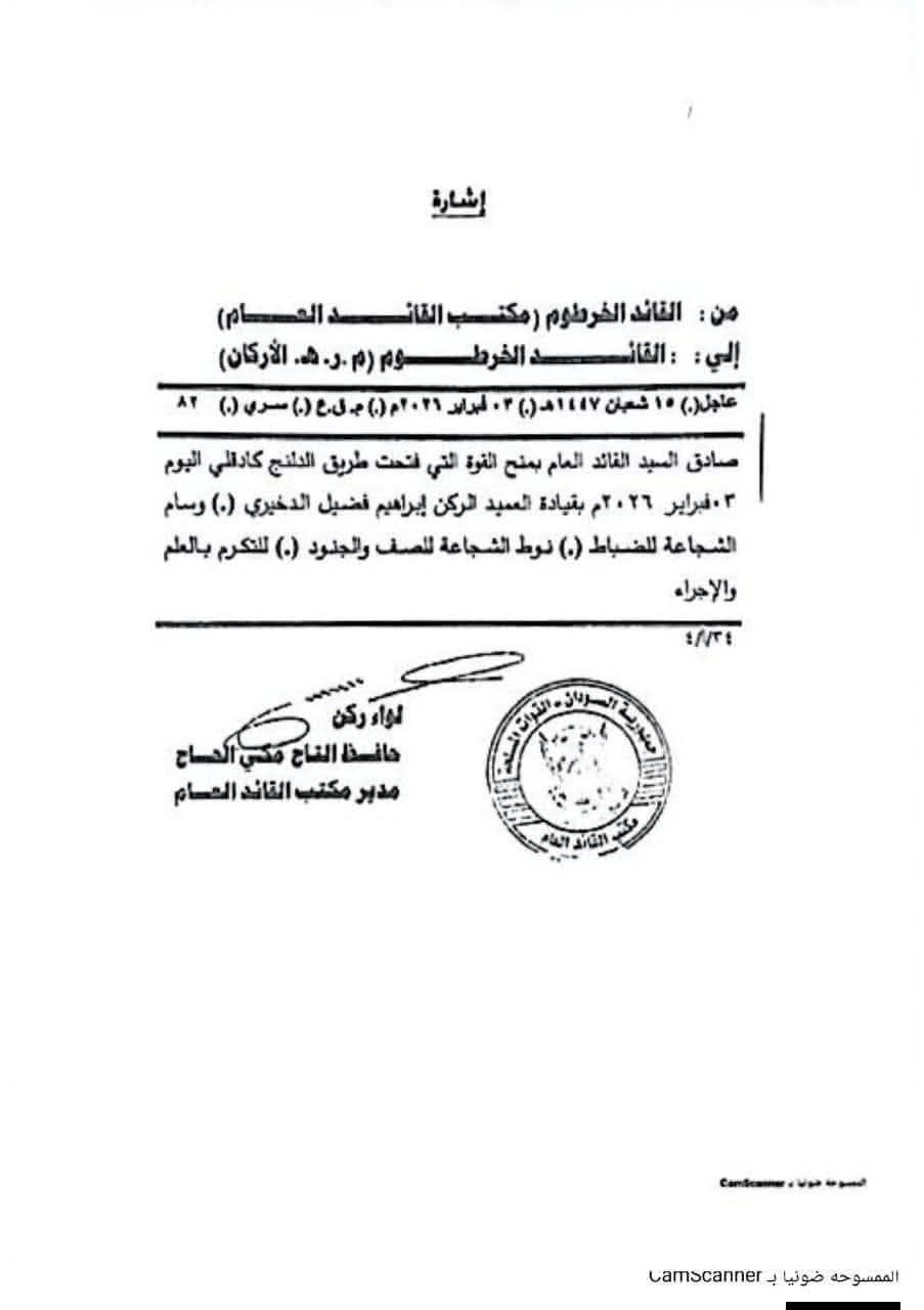 وكان رئيس مجلس السيادة قد أعلن في تصريحات سابقة من مدينة أم درمان وصول القوات المسلحة إلى كادقلي، مؤكداً أن الجيش قادر على الوصول إلى أي منطقة داخل البلاد، ومشدداً على أن القوات المسلحة مسنودة بإرادة الشعب السوداني في الدفاع عن وحدة البلاد وأمنها.