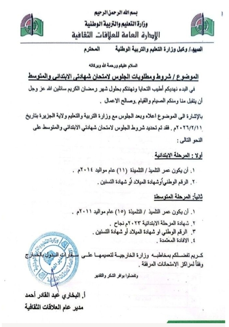 وبحسب المنشور الرسمي، اشترطت الوزارة للجلوس لامتحان الشهادة الابتدائية أن يكون عمر التلميذ أو التلميذة (11) عاماً من مواليد 2014، مع تقديم الرقم الوطني أو شهادة الميلاد أو شهادة التسنين. أما بالنسبة لامتحان الشهادة المتوسطة، فحددت أن يكون عمر الطالب (15) عاماً من مواليد 2011، إلى جانب تقديم شهادة نجاح المرحلة الابتدائية للعام 2023، والرقم الوطني أو شهادة الميلاد أو التسنين، إضافة إلى إفادة معتمدة ومخاطبة وزارة الخارجية لتعميمها وفقاً لمراكز الامتحانات المحددة.
