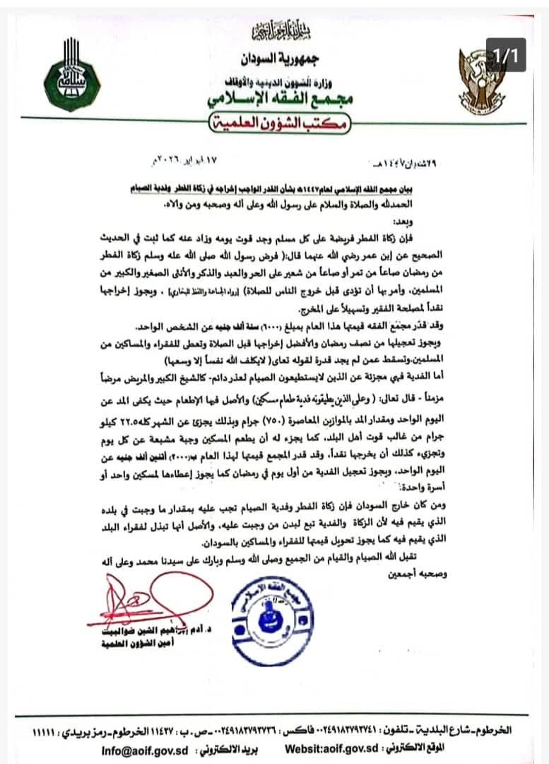 متابعات _ موجز الأحداث _ أصدر مجمع الفقه الإسلامي السوداني بياناً حدد فيه مقدار زكاة الفطر وفدية الصيام لعام 1447هـ، وذلك في إطار توجيه المسلمين بشأن الأحكام الشرعية المتعلقة بشهر رمضان.