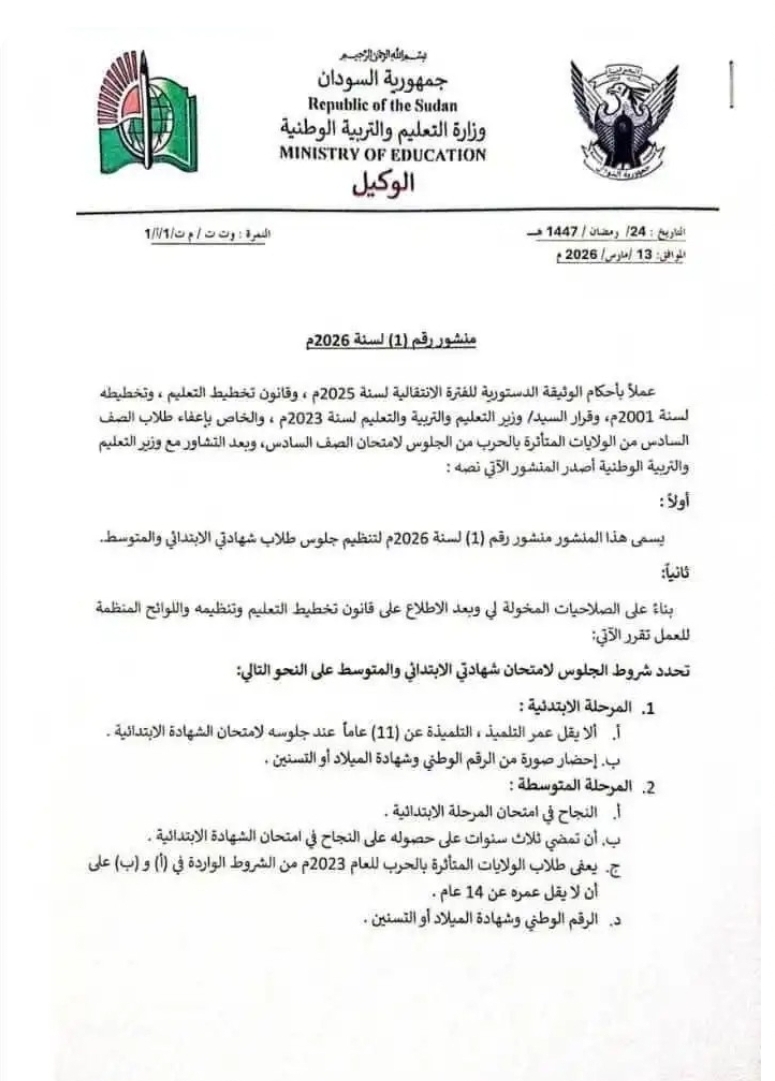 أما بالنسبة لامتحان الشهادة المتوسطة، فيشترط نجاح الطالب في الشهادة الابتدائية، وأن تكون قد مضت ثلاث سنوات على حصوله عليها. كما نص القرار على إعفاء طلاب الولايات المتأثرة بالحرب لعام 2023 من بعض هذه الشروط، على ألا يقل عمر الطالب عن 14 عاماً مع تقديم المستندات الثبوتية المطلوبة.