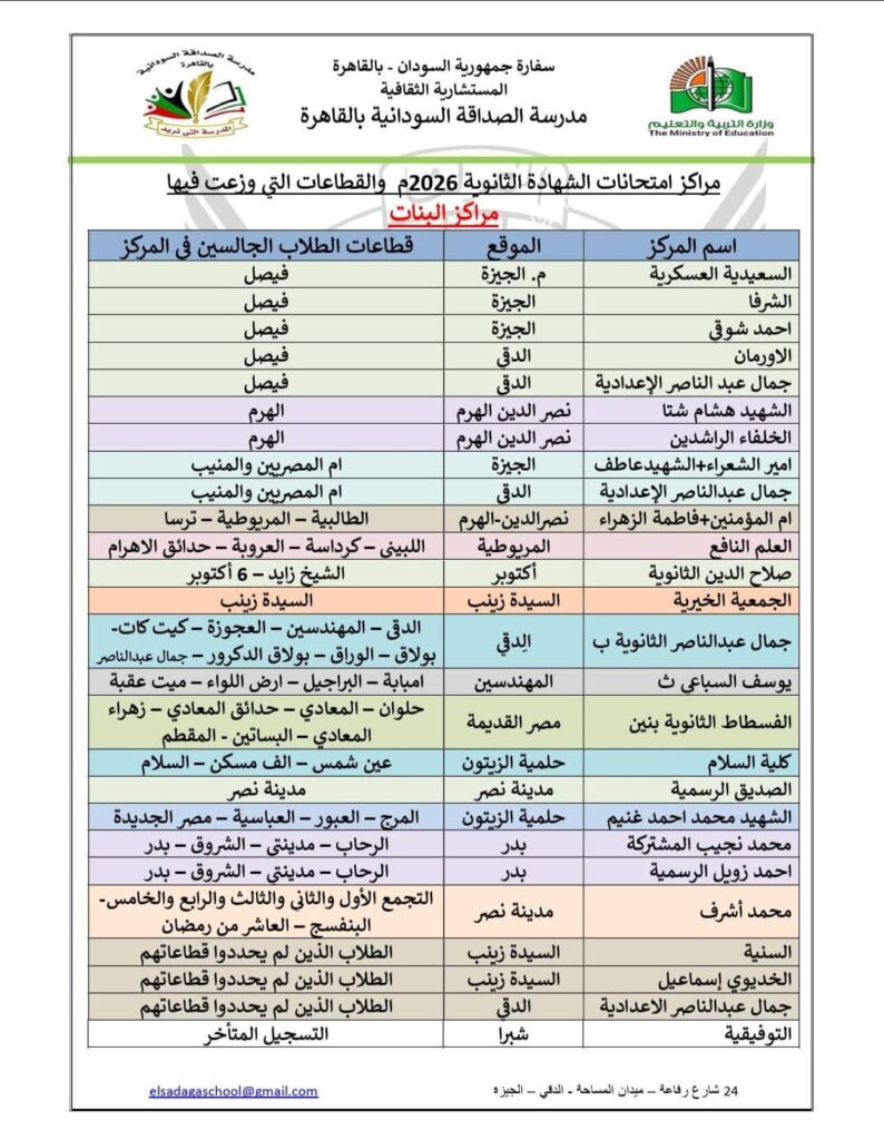 أعلنت إدارة مدرسة الصداقة السودانية بالقاهرة عن المخطط الجغرافي لتوزيع مراكز امتحانات الشهادة الثانوية للعام 2026. وقد تم توزيع المراكز بدقة بناءً على “القطاعات السكنية”، لضمان تغطية كافة المناطق التي يتواجد بها الطلاب السودانيون، مما يسهل عليهم الوصول إلى قاعات الامتحانات وتجنب الازدحام.
