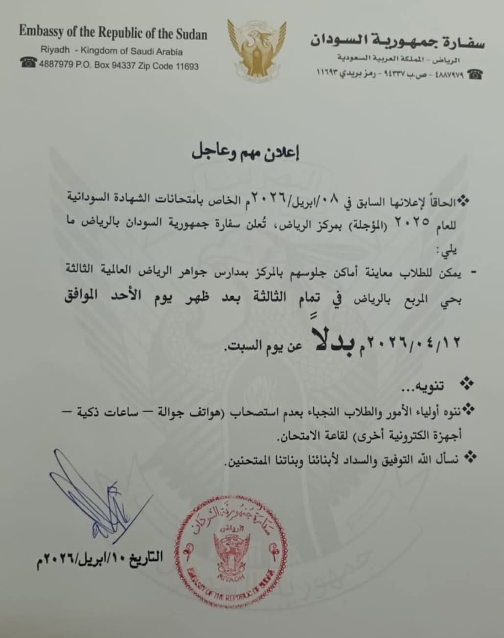 تنويه مهم من سفارة السودان بالرياض بشأن امتحانات الشهادة السودانية