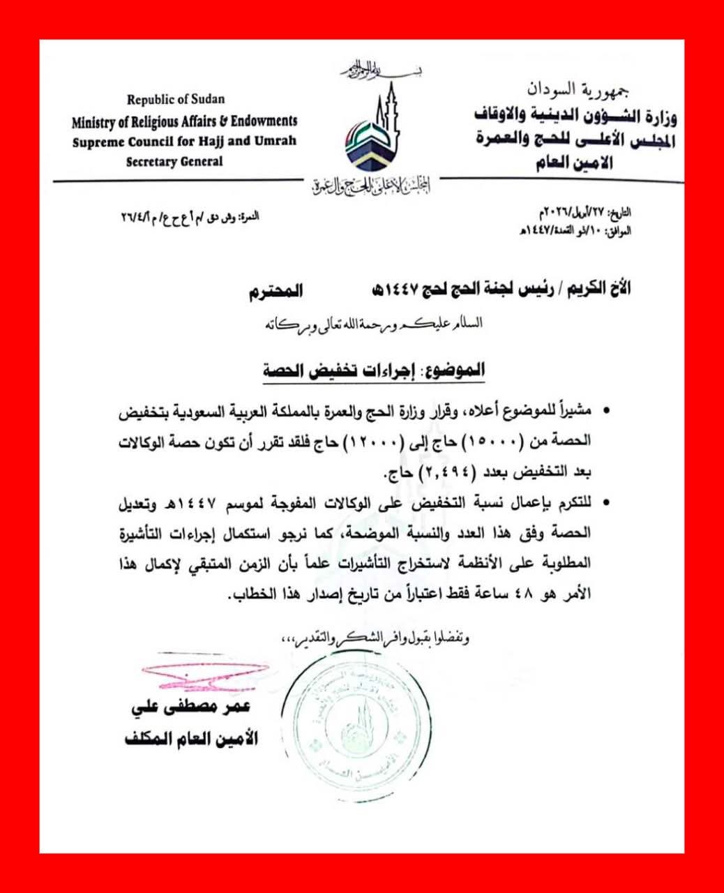 وكشف الخطاب الممهور بتوقيع الأمين العام المكلف، عمر مصطفى علي، عن تخفيض إجمالي حصة الحجاج من (١٥,٠٠٠) حاج إلى (١٢,٠٠٠) حاج. وبناءً على هذا القرار، تقرر أن تكون حصة الوكالات بعد التعديل (٢,٤٩٤) حاجاً فقط.
