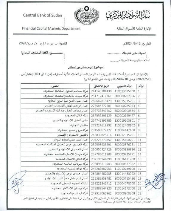 رفع بنك السودان المركزي، الحظر، عن مائة وثلاثة وستون شركة، لتعود للعمل في مجال التصدير والاستيراد، بعد قرار سابق بحظرها بسبب تهربها من دفع حصائل الصادر.