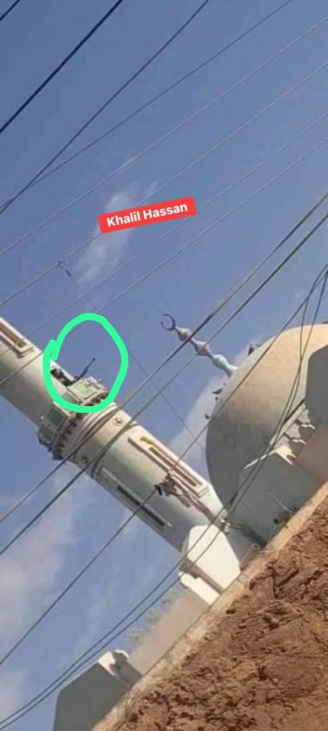 صورة متداولة تظهر قناصا للميليشيا الدعم السريع  على مئذنة أحد المساجد بقرية أم تريبات جنوبي الجزيرة.