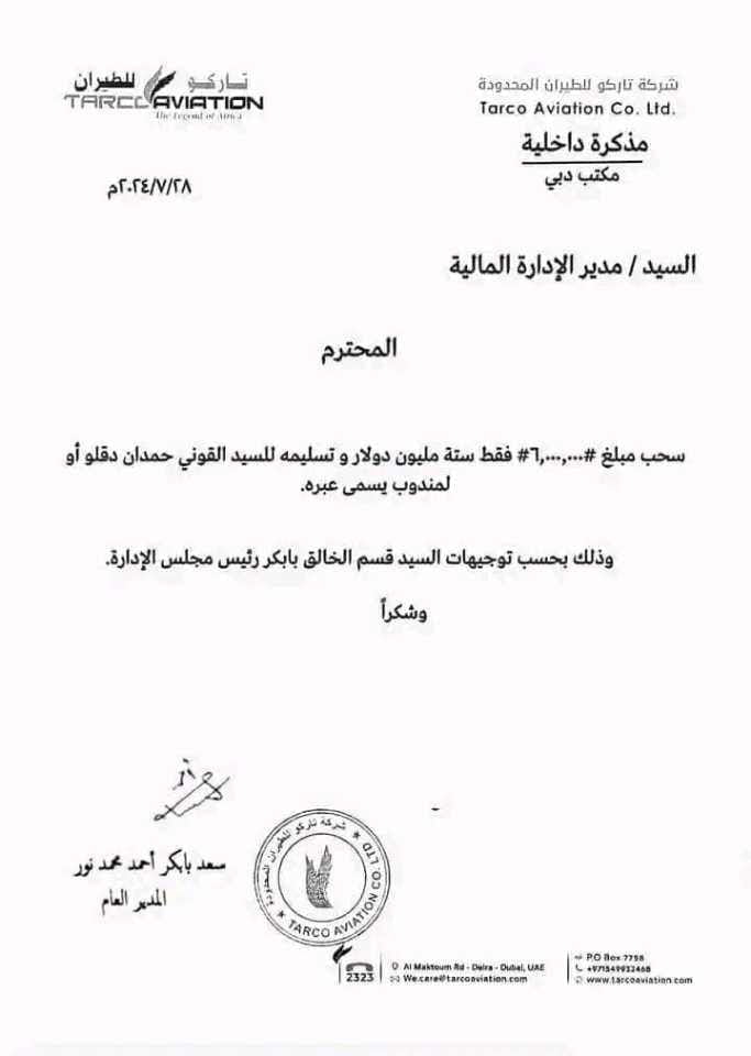 نفت شركة تاركو للطيران، صحة خطاب متداول يحمل ترويسة الشركة، يؤكد تحويل 6 ملايين دولار إلى شقيق حميدتي “القوني حمدان دقلو”.