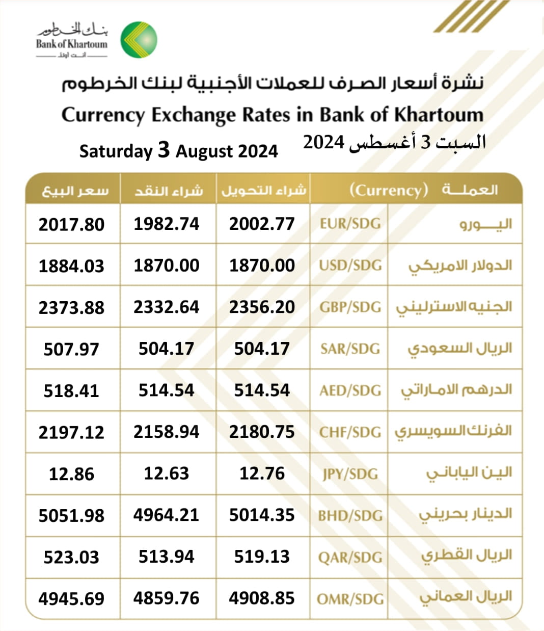 اخباراقتصاد بنك الخرطوم يعلن أسعار العملات الاجنبية مقابل الجنيه السوداني اليوم 3 اغسطس 2024م أغسطس 3, 2024 اعلن بنك الخرطوم أسعار العملات الاجنبية مقابل الجنيه السوداني اليوم 3 اغسطس 2024م أغسطس 3, 2024