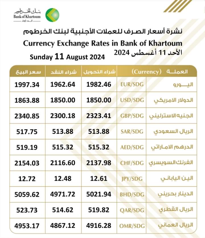 اقتصاد بنك الخرطوم يعلن سعر الجنيه السوداني مقابل العملات الأجنبية اليوم الأحد ١١ أغسطس أغسطس 11, 2024 بنك الخرطوم سعر الجنيه السوداني مقابل العملات الأجنبية ببنك الخرطوم ليوم الأحد ١١ أغسطس ٢٠٢٤م أغسطس 11, 2024
