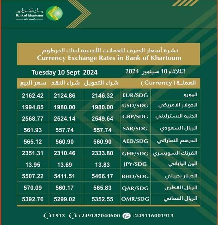 اقتصاد ارتفاع كبير في أسعار العملات الأجنبية ببنك الخرطوم اليوم الثلاثاء ١٠ سبتمبر ٢٠٢٤م سبتمبر 10, 2024 بنك الخرطوم سعر الجنيه السوداني مقابل العملات الأجنبية ببنك الخرطوم اليوم الثلاثاء ١٠ سبتمبر ٢٠٢٤م سبتمبر 10, 2024