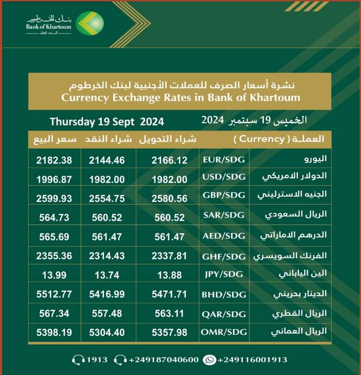 اقتصاد أسعار العملات الأجنبية ببنك الخرطوم اليوم الخميس ١٩ سبتمبر ٢٠٢٤م سبتمبر 19, 2024 بنك الخرطوم سبتمبر 19, 2024