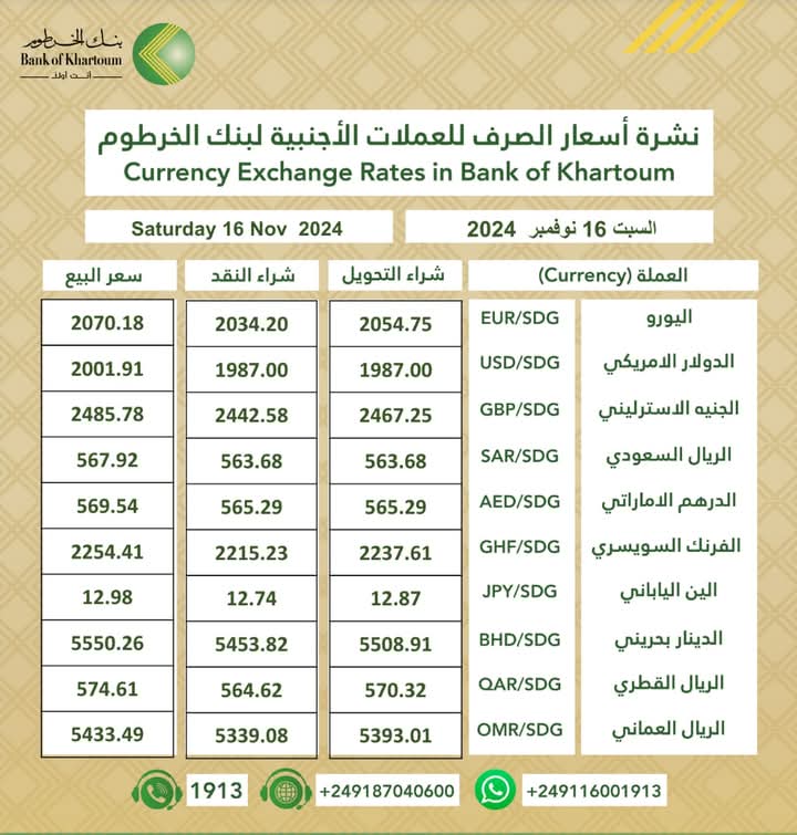 اقتصاد بنك الخرطوم يعلن عن سعر الجنيه السوداني مقابل العملات الأجنبية اليوم السبت ١٦ نوفمبر ٢٠٢٤م نوفمبر 16, 2024 بنك الخرطوم سعر الجنيه السوداني مقابل العملات الأجنبية ببنك الخرطوم اليوم السبت ١٦ نوفمبر ٢٠٢٤م نوفمبر 16, 2024