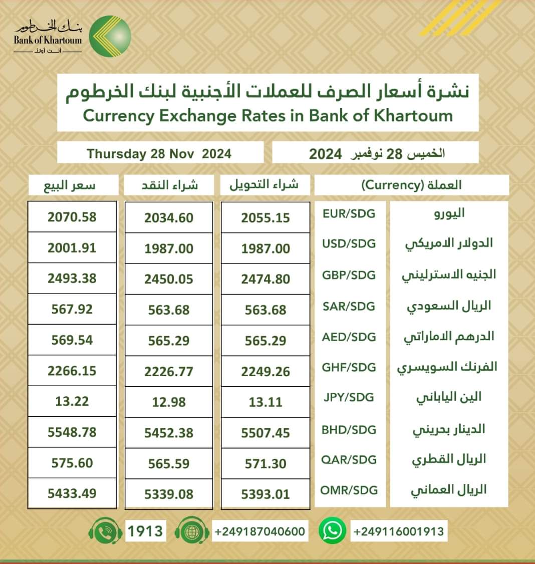 اقتصاد بنك الخرطوم يعلن عن سعر الجنيه السوداني مقابل العملات الأجنبية اليوم الخميس ٢٨ نوفمبر ٢٠٢٤ نوفمبر 28, 2024 بنك الخرطوم نوفمبر 28, 2024