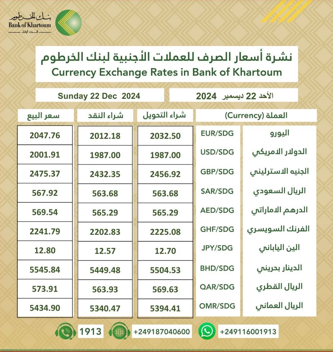 اقتصاد بنك الخرطوم يعلن عن سعر الجنيه السوداني مقابل العملات الأجنبية اليوم الأحد 22 ديسمبر 2024 ديسمبر 22, 2024 بنك الخرطوم سعر الجنيه السوداني مقابل العملات الأجنبية اليوم الأحد 22 ديسمبر 2024 ببنك الخرطوم ديسمبر 22, 2024