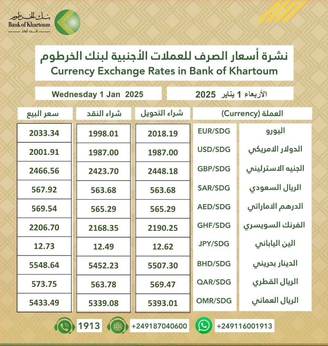 بنك الخرطوم يعلن عن سعر الجنيه السوداني مقابل العملات الأجنبية اليوم الأربعاء الأول من يناير 2025