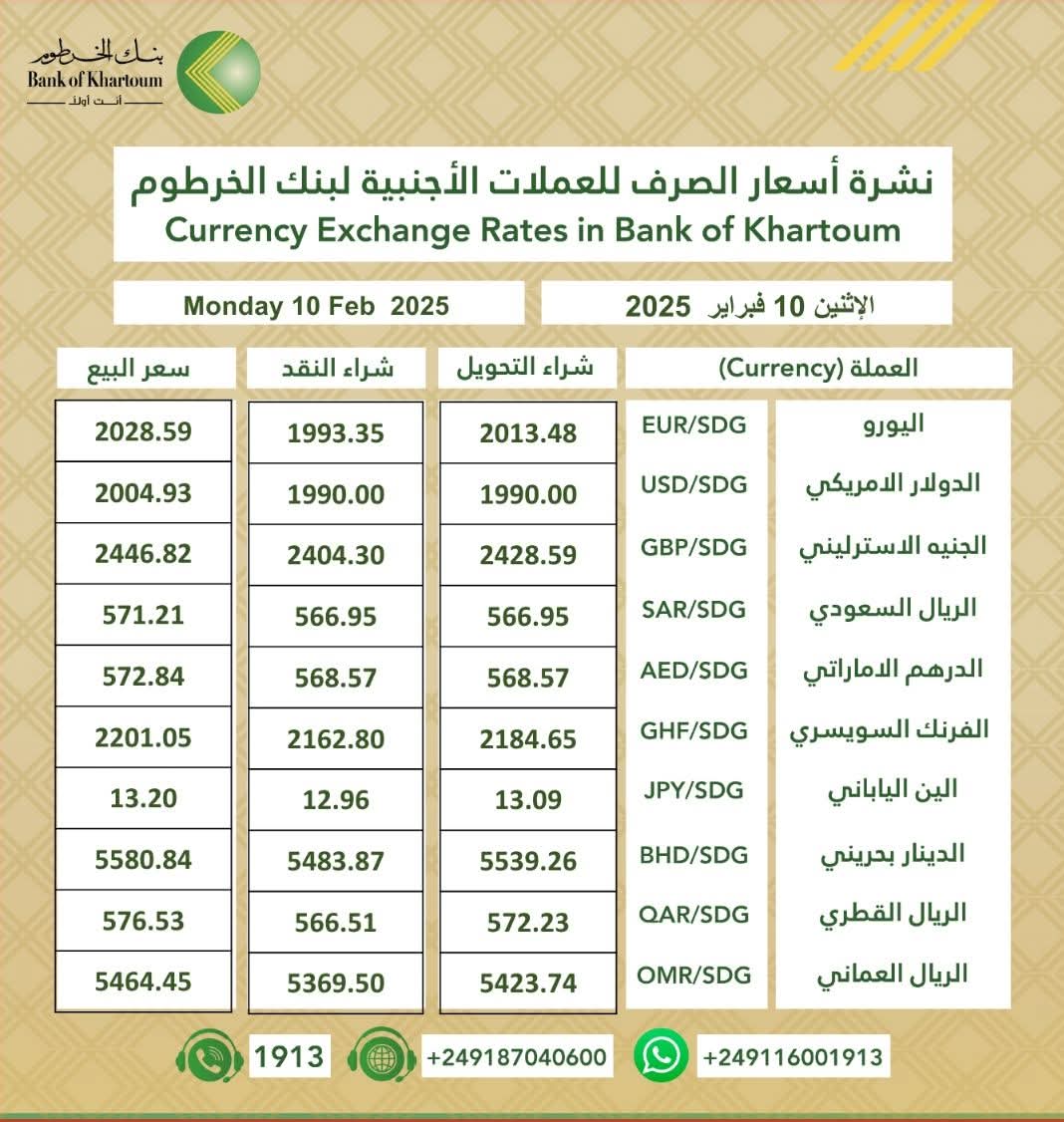 اقتصاد أسعار العملات الأجنبية في بنك الخرطوم اليوم الإثنين 10 فبراير 2025م متابعات موجز الأحداث فبراير 10, 2025 بنك الخرطوم سعر الجنيه السوداني مقابل العملات الأجنبية اليوم الاثنين 10 فبراير 2025 في بنك الخرطوم فبراير 10, 2025