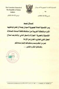 أعلنت القنصلية العامة لجمهورية السودان في جدة لمواطنيها الكرام في المنطقة الغربية عن استئناف جميع خدمات المعاملات القنصلية والهجرية، بما في ذلك خدمات الجوازات والسجل المدني. جاء ذلك بعد أن تم إصلاح العطل الفني الذي كان قد طرأ مؤخرًا، مما أثر على سير العمل داخل القنصلية بشكل مؤقت.