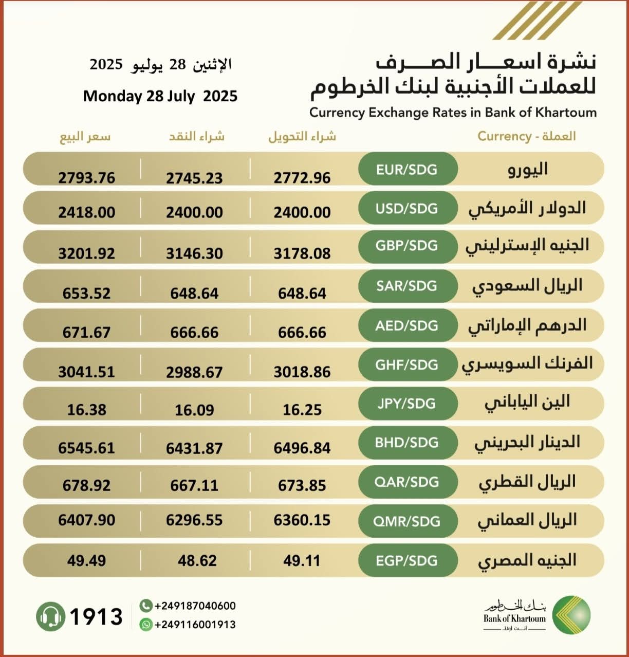 متابعات _ موجز الأحداث _ أصدر بنك الخرطوم، صباح اليوم الإثنين الموافق 28 يوليو 2025، نشرة رسمية مُحدَّثة لأسعار صرف العملات الأجنبية مقابل الجنيه السوداني، والتي أظهرت استقرارًا ملحوظًا في بعض العملات الرئيسية، مقابل تقلبات لافتة في عملات أخرى، وسط متابعة كثيفة من المتعاملين في السوق المصرفي والمواطنين.
