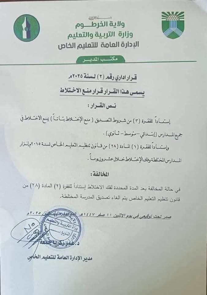 متابعات _ موجز الأحداث _ أصدرت وزارة التربية والتعليم بولاية الخرطوم (الإدارة العامة للتعليم الخاص) قراراً إدارياً يقضي بمنع الاختلاط بين طلاب الذكور والإناث داخل المدارس الخاصة بجميع مراحل التعليم (الابتدائي – المتوسط – الثانوي). القرار رقم (2) لسنة 2025، يستند إلى الفقرة (3) من شروط التصديق، والمادة (28) من قانون تنظيم التعليم الخاص لسنة 2015، وينص على إلزام المدارس بإلغاء نظام “المدرسة المختلطة” خلال فترة أقصاها عشرة أيام من صدور القرار.
