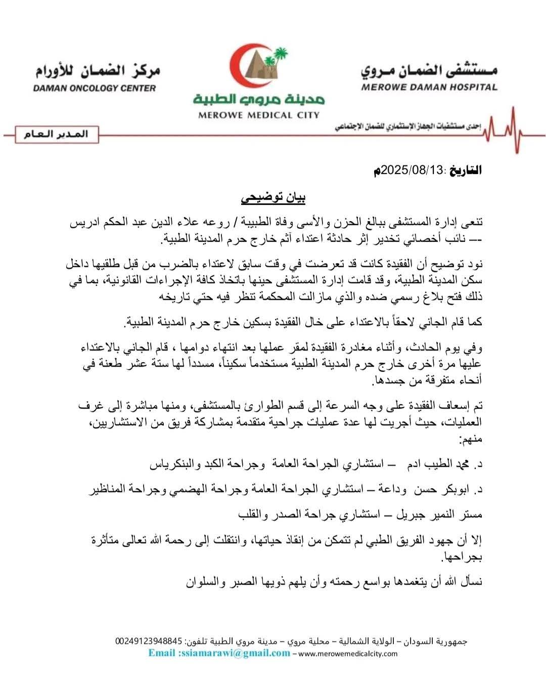 في حادثة مأساوية هزّت الأوساط الطبية والمجتمعية في السودان، أعلنت إدارة مستشفى الضمان مروي ومدينة مروي الطبية، الأربعاء، عن وفاة الطبيبة روعة علاء الدين عبد الحكم إدريس، اختصاصية التخدير، إثر تعرضها لاعتداء وحشي بالضرب والطعن داخل وخارج سكن الأطباء، ما أسفر عن إصابتها بجروح خطيرة أودت بحياتها رغم محاولات إنقاذها. وأكدت الإدارة أن الحادثة محل إجراءات قانونية وقضائية، مشددة على أنها لن تتهاون في ملاحقة الجاني حتى ينال عقابه.