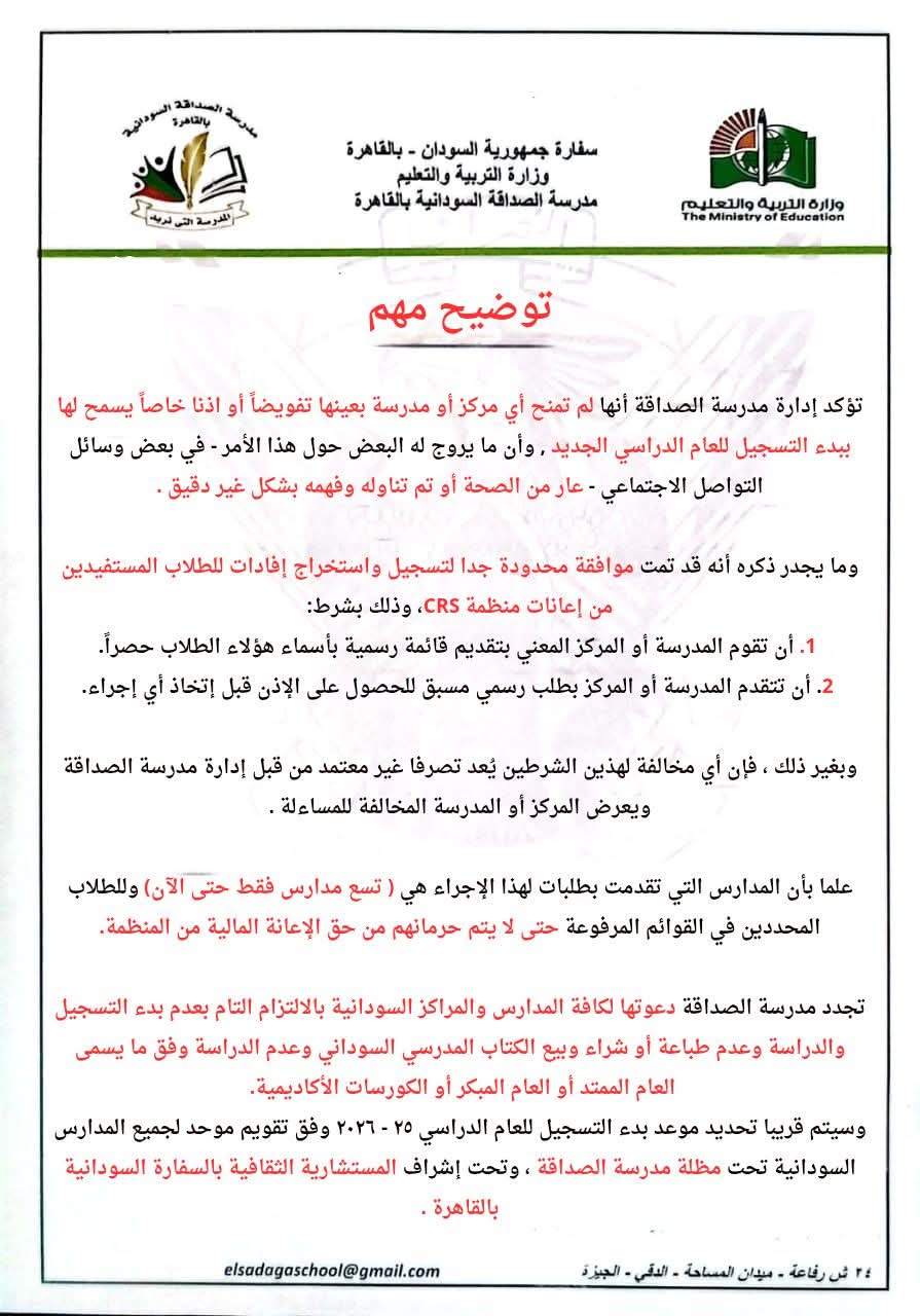 واختتمت إدارة مدرسة الصداقة بيانها بالتأكيد على أن موعد بدء التسجيل سيُعلن قريباً وفق تقويم دراسي موحد تحت إشراف المستشارية الثقافية بالسفارة السودانية بالقاهرة.
